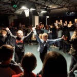 Unter der Anleitung der beiden Schauspielleiter Angela Grüter und Friedemann Lange musste das Publikum sogar mit vereinten Kräften die Bühne zu einer Kampfarena umbauen, in deren Scheinwerferlicht unter allgemeinem Jubel Ritter Delorges den gefährlichen Löwen wagemutig den Handschuh entriss. Zum krönenden Abschluss wurde Schillers „Handschuh“ unter stampfenden ACDC-Klängen zu einer, von einer wilden Rockergruppe viel umkämpften, „Handtäsch“ humoristisch umfunktioniert.